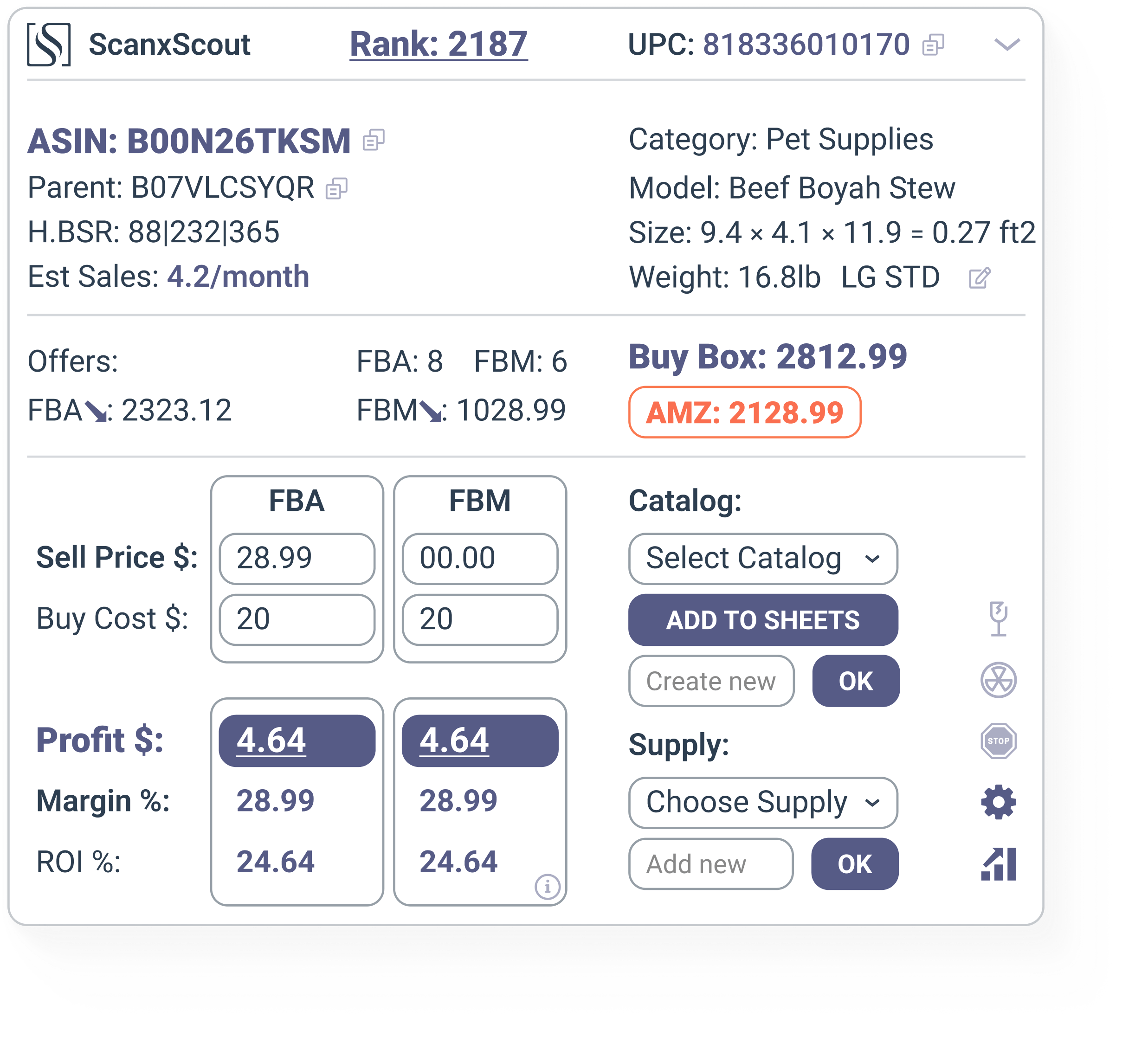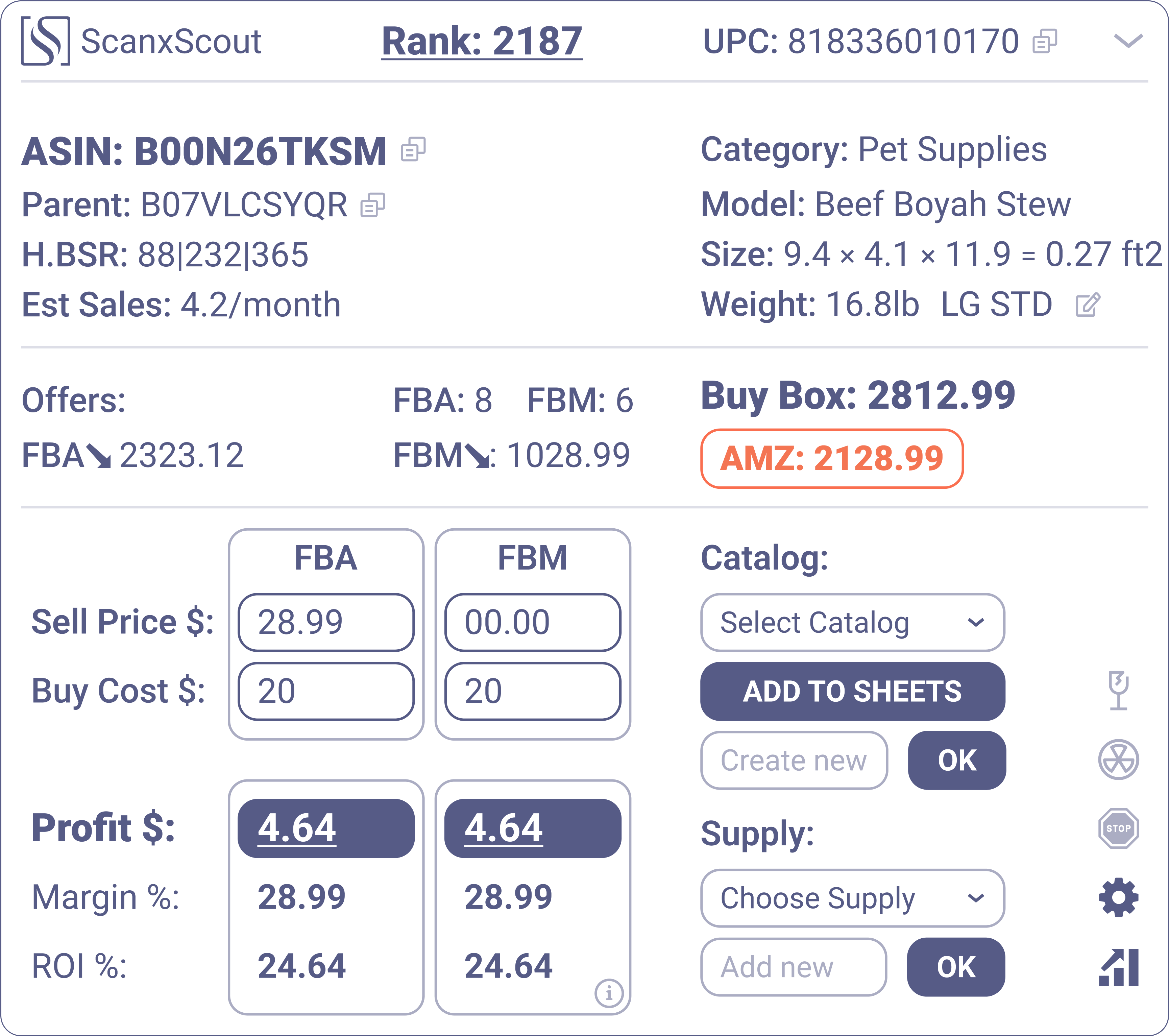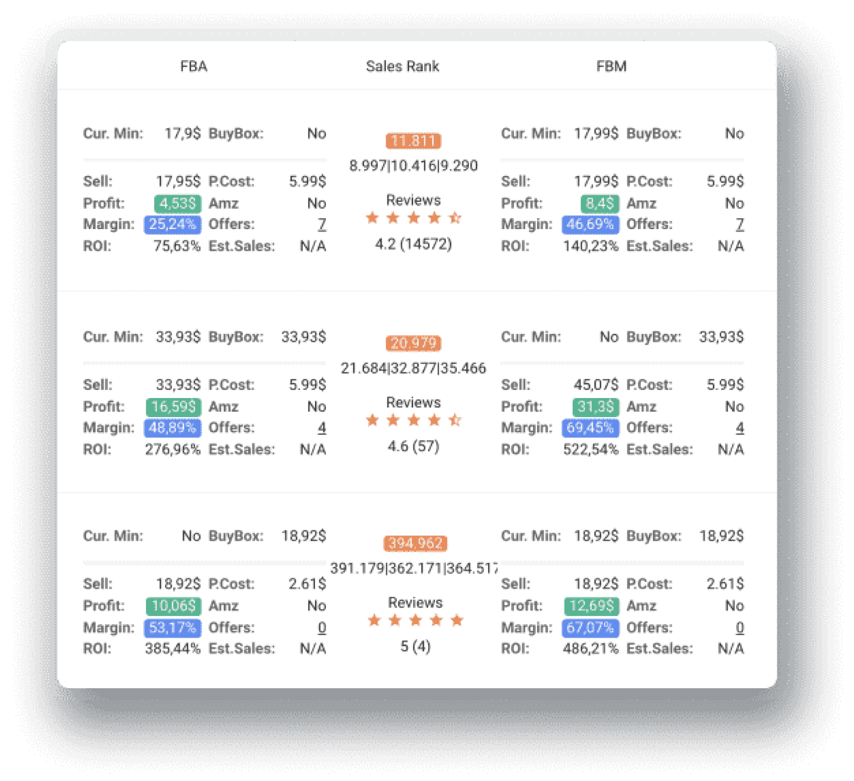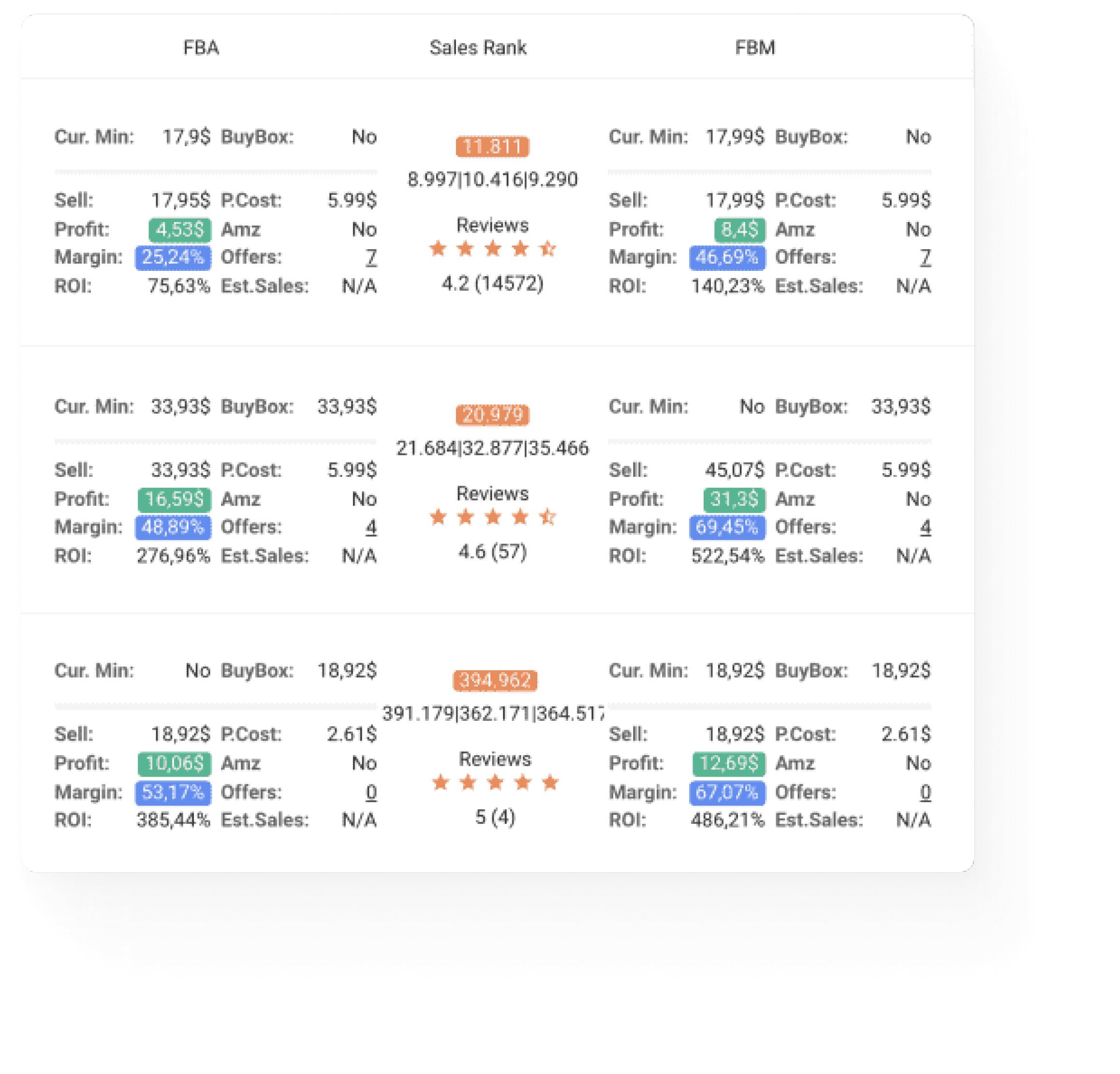 The user is able to process large numbers of listings at once. Quickly and accurately determine profit, margin, Amazon fees and 59 other key metrics.